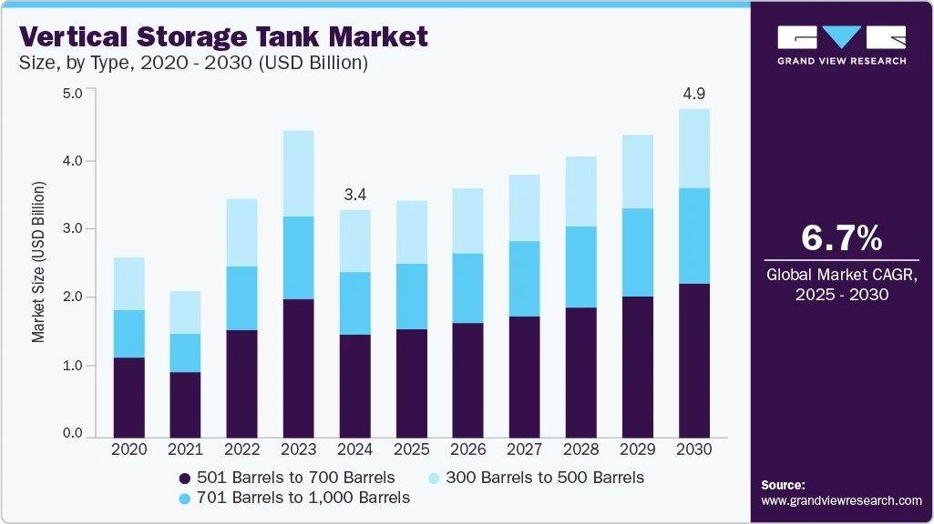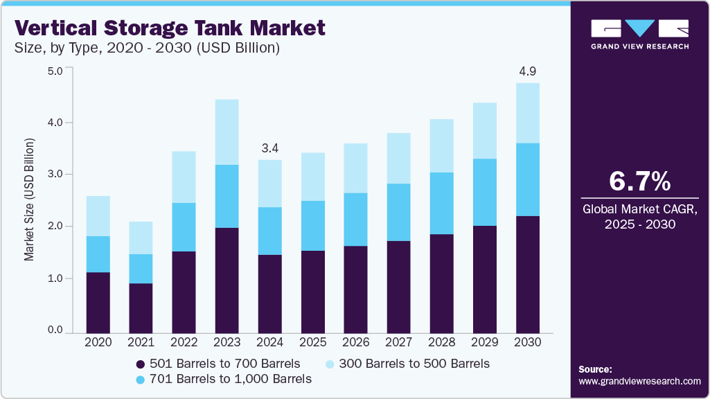The global vertical storage tank market was valued at USD 3.38 billion in 2024 and is anticipated to grow to USD 4.88 billion by 2030, representing a CAGR of 6.7% from 2025 to 2030. This growth is primarily driven by an increasing demand for vertical storage tanks across sectors such as chemicals, oil & gas, water treatment, and food processing.