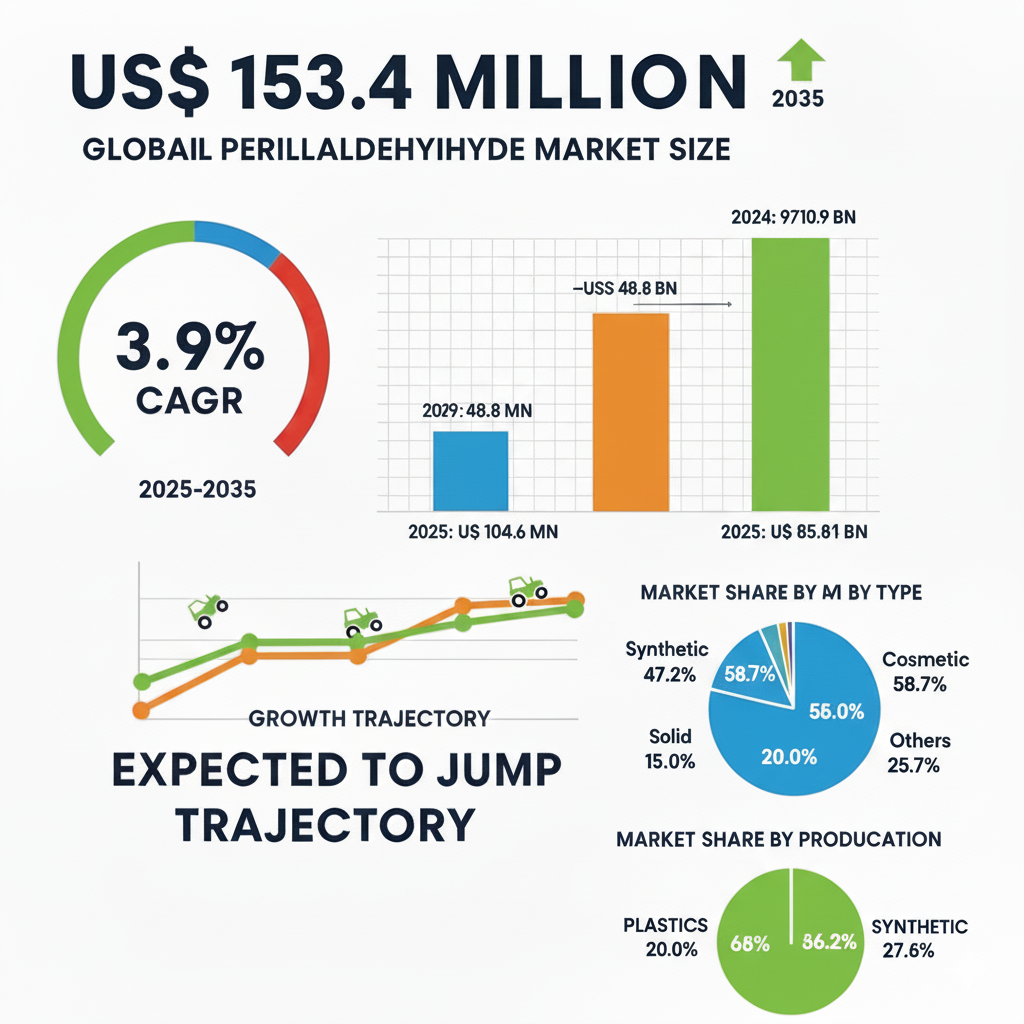The global perillaldehyde market is poised for steady growth through 2035, fueled by rising demand for natural aromatic compounds in fragrances, personal care, and eco-friendly surfactants. According to Future Market Insights (FMI), the market is valued at USD 104.6 million in 2025 and is projected to hit USD 153.4 million by 2035, advancing at a compound annual growth rate (CAGR) of 3.9%.