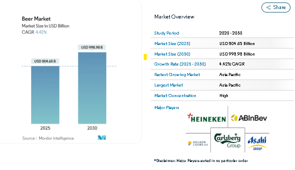 The global beer market is valued at USD 804.65 billion in 2025 and is projected to reach USD 998.98 billion by 2030, supported by consistent consumer demand, higher spending capacity, widening product portfolios, and expanding on-trade and off-trade channels. Market growth is driven by premium beer offerings, low-alcohol varieties, and functional beverage formats that attract younger demographics. Increased digital commerce adoption and the expanding middle-income population in Asia-Pacific further support the market’s stability. Europe’s mature craft beer landscape, North America’s hospitality revival, and sustainable packaging adoption also contribute to the overall outlook.