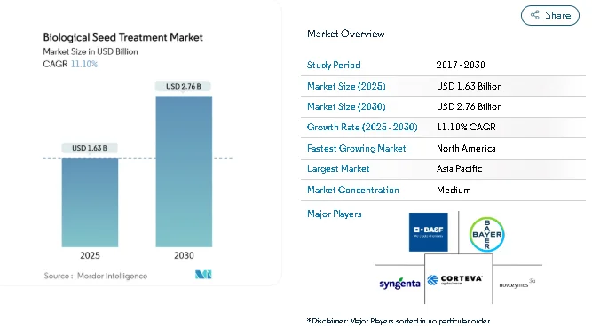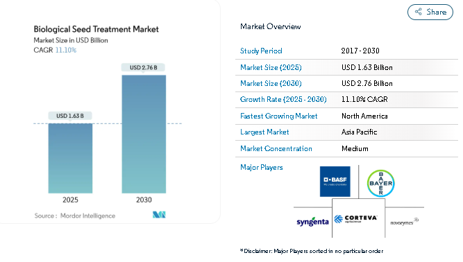 The biological seed treatment market is entering a phase of strong global expansion as growers shift toward safer, residue-free, and sustainable crop input solutions. Valued at USD 1.63 billion in 2025, the market is projected to reach USD 2.76 billion by 2030, supported by an 11.1% CAGR during the forecast period.