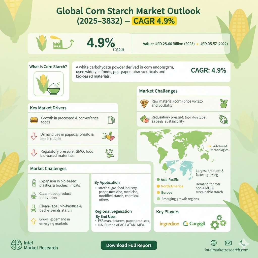 According to a new report from Intel Market Research, the global Corn Starch market was valued at USD 25.66 billion in 2025 and is projected to reach USD 35.52 billion by 2032, growing at a steady CAGR of 4.9% during the forecast period (2025-2032). This sustained expansion is propelled by the ingredient's irreplaceable role as a thickening and stabilizing agent in modern food manufacturing, coupled with its escalating utility across diverse industrial sectors.