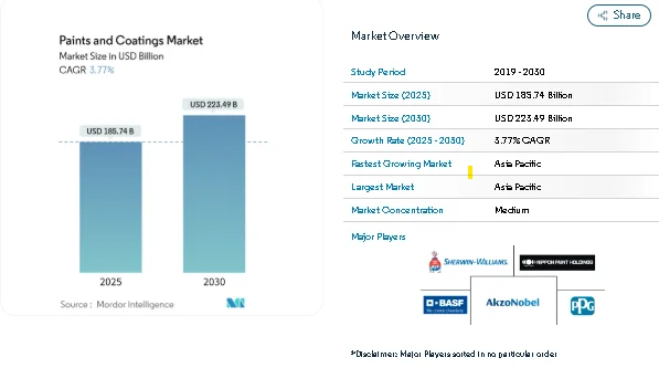 The market is projected to increase from USD 185.74 billion in 2025 to USD 223.49 billion by 2030, driven by steady construction activity, renovation cycles, infrastructure investments, and rising demand for low-emission finishes. The global paints and coatings market continues to show stable volume growth despite raw-material cost volatility and evolving regulatory conditions, supported further by affordable housing expansion in Asia-Pacific and public infrastructure spending in North America