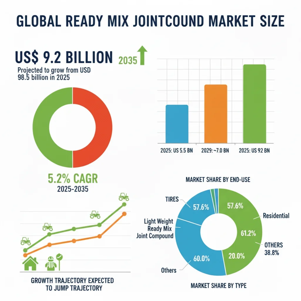 The global ready-mix joint compound market is poised for robust expansion through 2035, fueled by surging residential construction, infrastructure investments, and demand for efficient, eco-friendly finishing solutions. According to Future Market Insights (FMI), the market is valued at USD 5.5 billion in 2025 and is projected to reach USD 9.2 billion by 2035, expanding at a compound annual growth rate (CAGR) of 5.2%.
