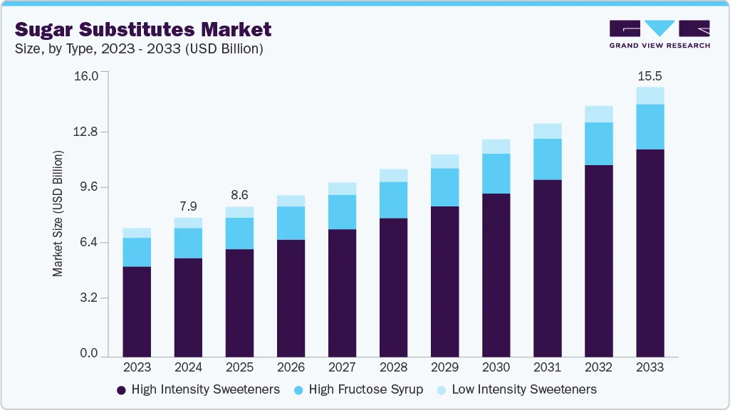 The global sugar substitutes market was valued at USD 7.97 billion in 2024 and is projected to reach USD 15.48 billion by 2033, expanding at a compound annual growth rate (CAGR) of 7.6% from 2025 to 2033. This growth is driven by rising health consciousness and an increasing prevalence of diabetes and obesity.