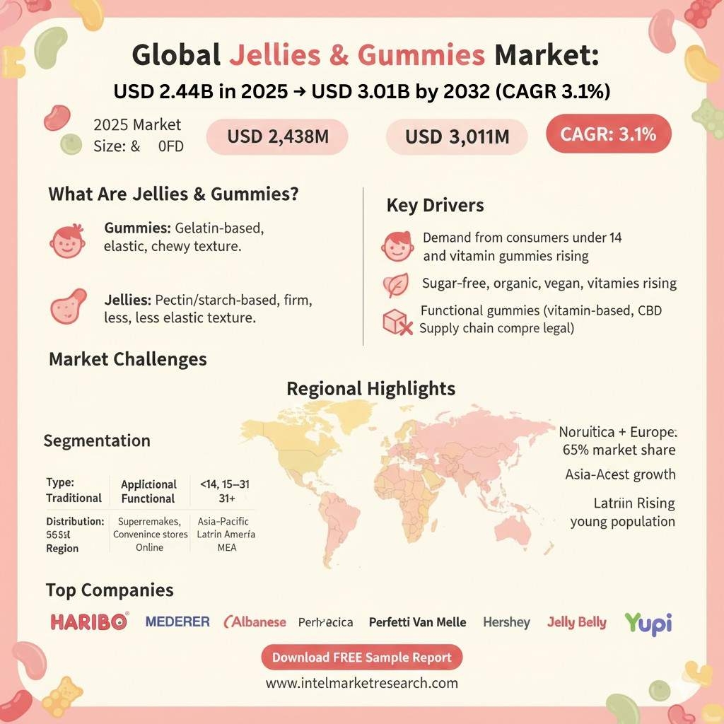 According to a new report from Intel Market Research, the global Jellies and Gummies market was valued at USD 2,438 million in 2025 and is projected to reach USD 3,011 million by 2032, growing at a steady CAGR of 3.1% during the forecast period (2025–2032). This sustained expansion is primarily fueled by consistent demand from younger demographics, continuous product innovation, and the growing trend of incorporating functional ingredients into confectionery formats.