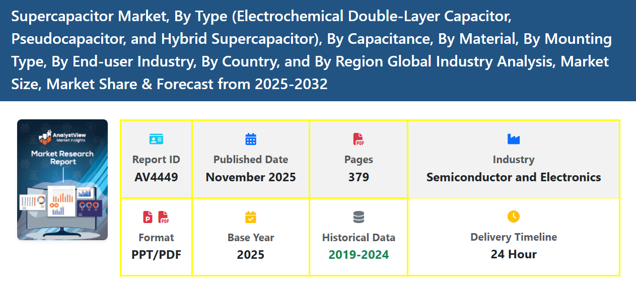 The Supercapacitor Market is experiencing robust growth as energy-storage technologies evolve to meet the demands of modern electronics, electric mobility, and renewable-energy systems. Supercapacitors—also known as ultracapacitors—bridge the gap between traditional capacitors and batteries by providing extremely fast charge–discharge cycles, high power density, long operational life, and reliable performance under harsh conditions. These attributes make them ideal for applications requiring quick bursts of energy, smoothing power fluctuations, or supporting peak load demands.