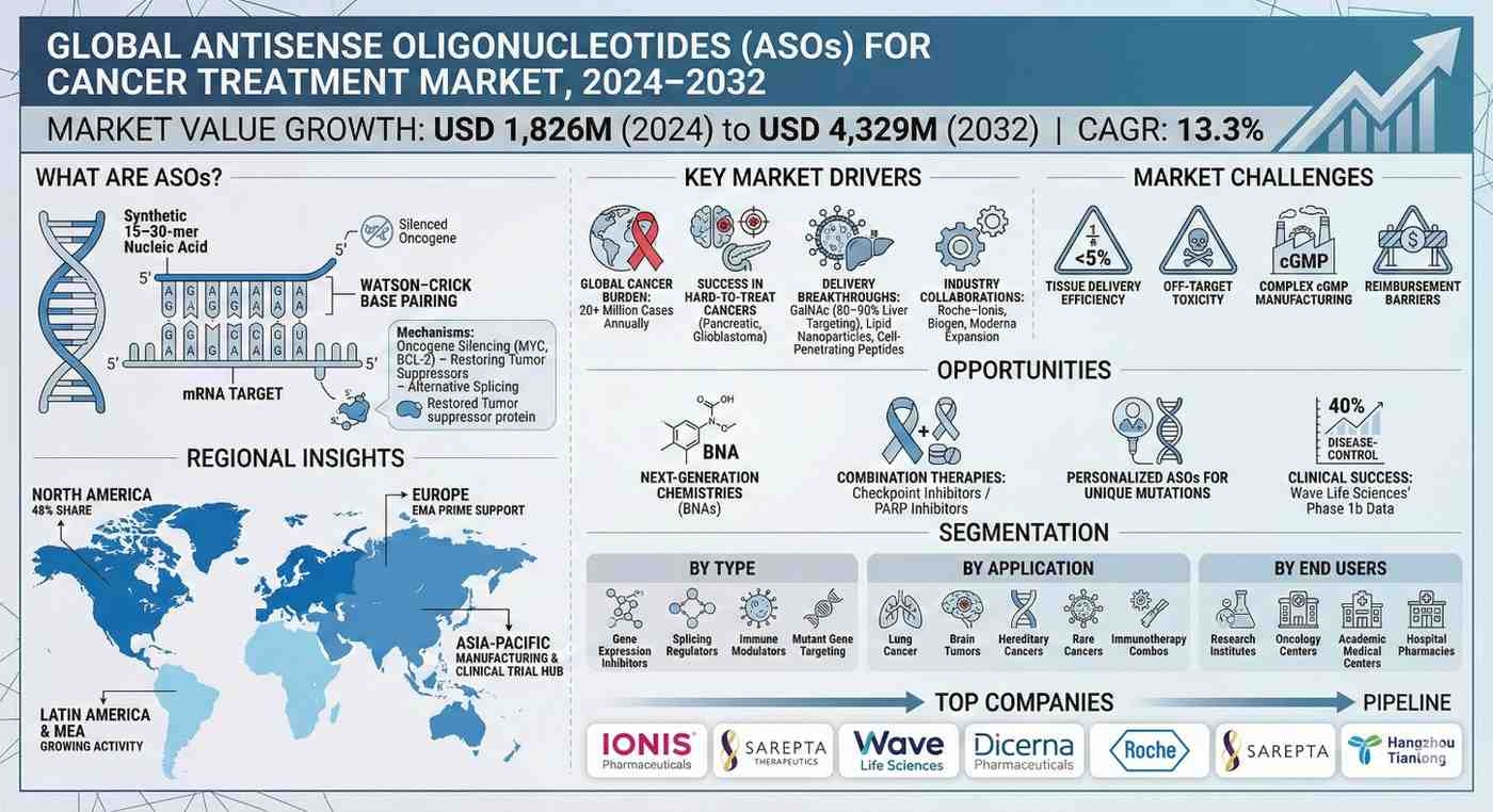According to a new report from Intel Market Research, the global Antisense Oligonucleotides for Cancer Treatment market was valued at USD 1,826 million in 2024 and is projected to reach USD 4,329 million by 2032, growing at an impressive CAGR of 13.3% during the forecast period (2025-2032). This significant growth trajectory reflects increasing clinical adoption of ASO-based therapies, rapid advances in precision oncology, and the urgent need for innovative cancer treatments.