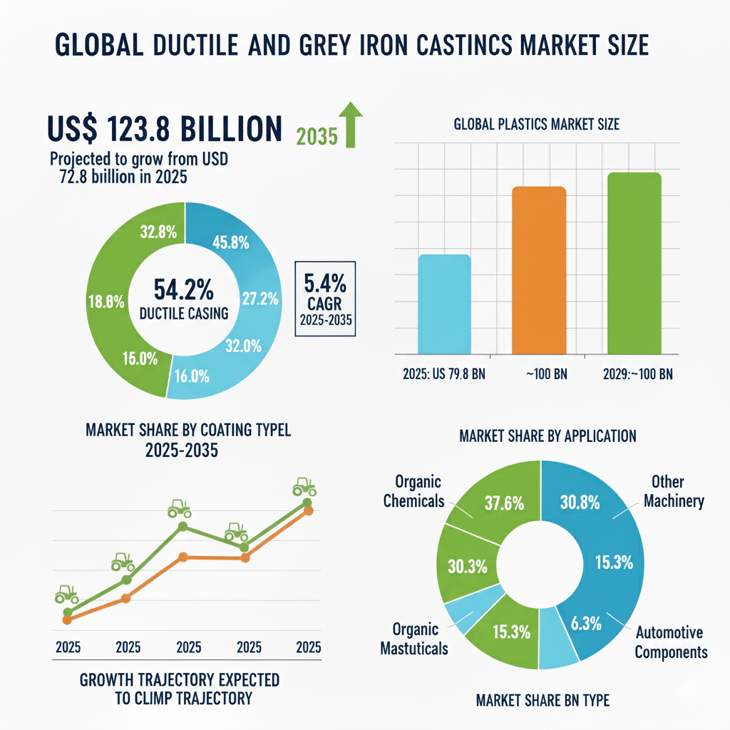 The FMI report, “Ductile and Grey Iron Casting Products Market Size, Share, and Forecast 2025–2035,” indicates global revenues will surge by nearly USD 51 billion over the decade, propelled by escalating demand for durable components in automotive, machinery, and renewable energy sectors amid urbanization and industrial digitization.