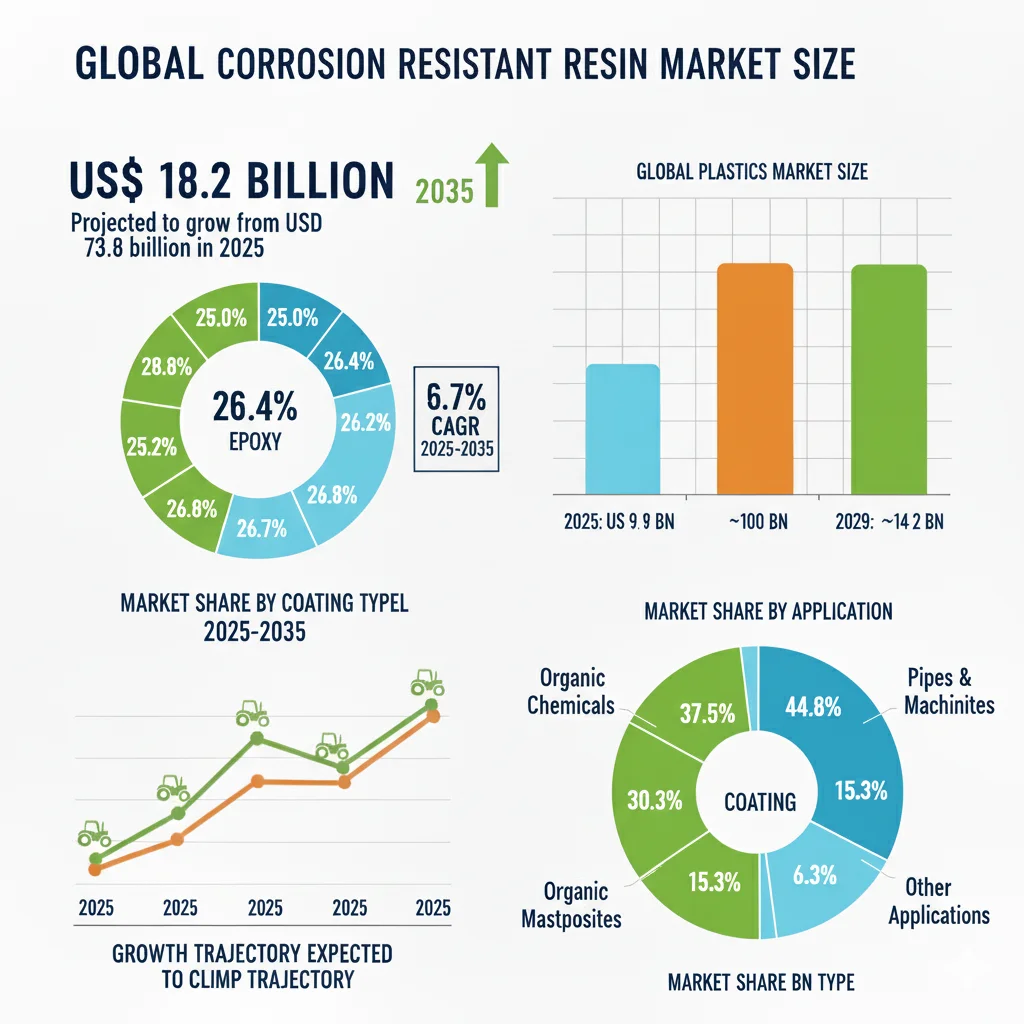 The global corrosion-resistant resin market is poised for robust expansion through 2035, fueled by surging demand for protective coatings in harsh environments, regulatory pushes for eco-friendly materials, and innovations in high-performance formulations. According to Future Market Insights (FMI), the market is valued at USD 9.5 billion in 2025 and is projected to reach USD 18.2 billion by 2035, expanding at a compound annual growth rate (CAGR) of 6.7%.