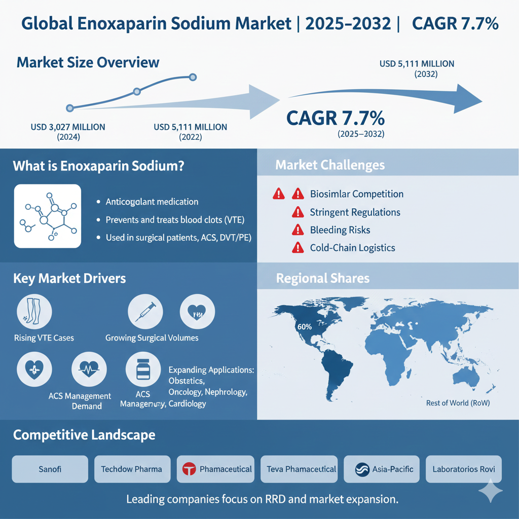 According to a new report from Intel Market Research, the global Enoxaparin Sodium market was valued at USD 3,027 million in 2024 and is projected to reach USD 5,111 million by 2032, growing at a steady CAGR of 7.7% during the forecast period (2025–2032). This sustained expansion is driven by increasing global incidence of thrombotic disorders, rising surgical volumes, and growing adoption in acute coronary syndrome management.