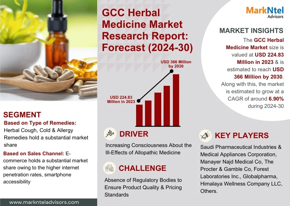 MarkNtel Advisors, a leading market research and consulting firm, has announced the release of its latest study titled GCC Herbal Medicine Market Research Report: Forecast (2024-2030). This report provides a detailed assessment of the GCC Herbal Medicine Market, covering its evolving dynamics, emerging trends, key growth drivers, major challenges, and competitive landscape.