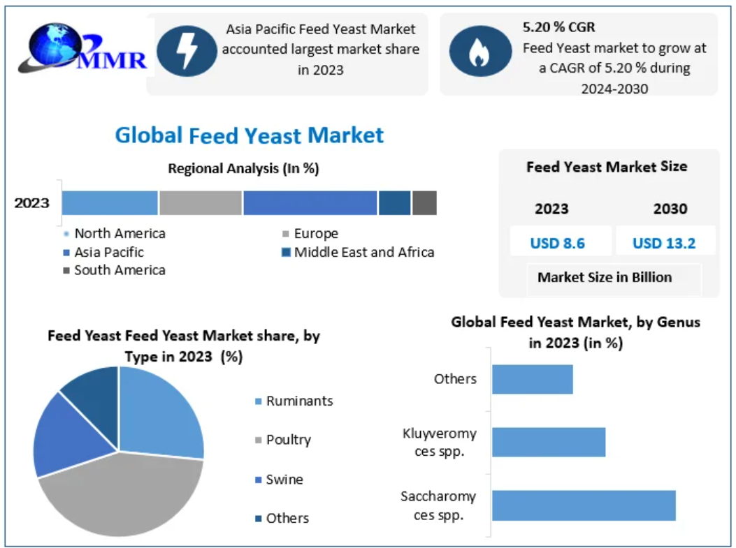 Feed Yeast Market is anticipated to reach USD 13.2 Billion by 2030 from USD 8.6 Billion in 2023 at a CAGR of 5.20 % during a forecast period.