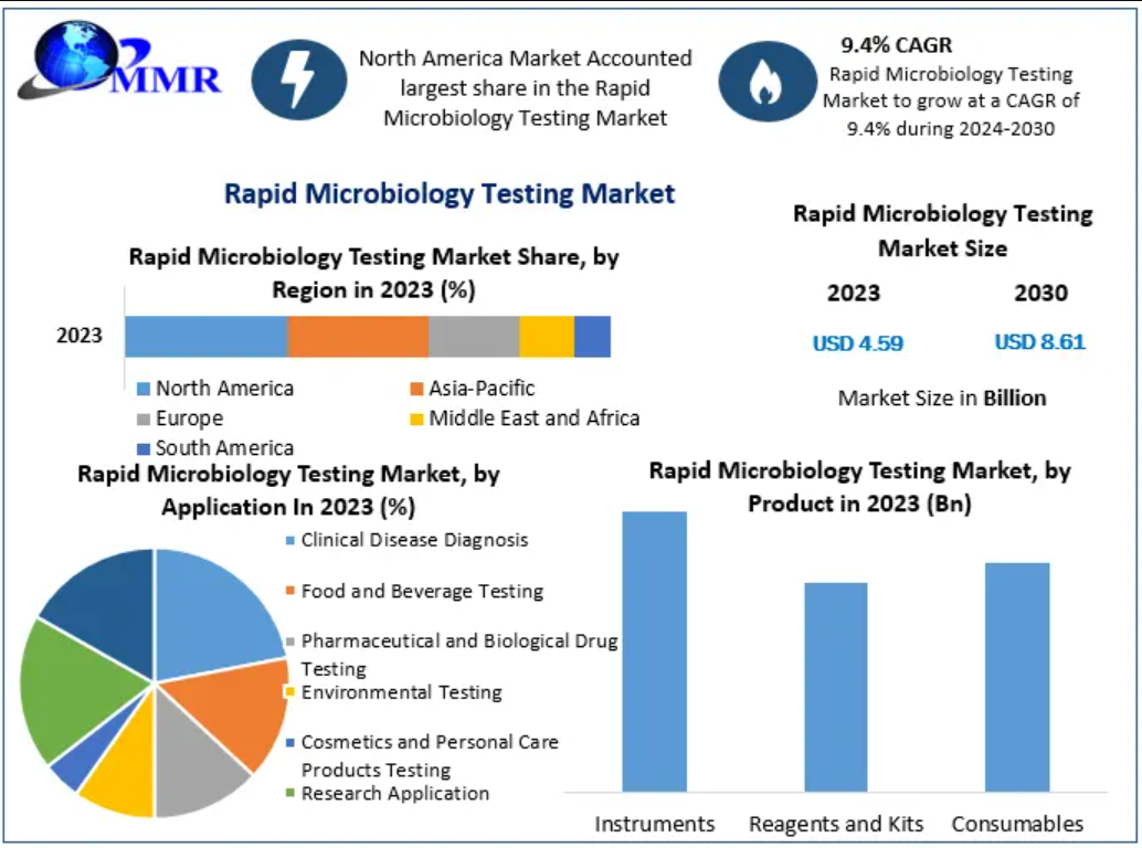 Rapid Microbiology Testing Market has valued at US$ 4.59 Bn. in 2023. The Global Rapid Microbiology Testing Market size is estimated to grow at a CAGR of 9.4% over the forecast period.