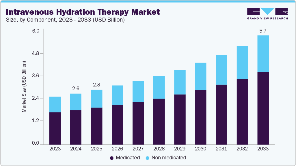 - By component, the medicated segment held the largest revenue share of 67.4% in the IV hydration therapy market in 2024. This dominance is due to the increasing demand for medications administered through the IV route, along with key players focusing on developing customizable medicated IV hydration therapy solutions.