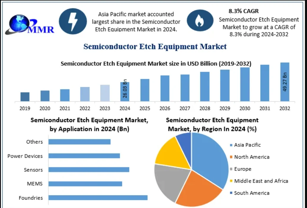 Semiconductor Etch Equipment Market was valued at USD 26.03 Bn in 2024 and is expected to reach USD 49.27 Bn by 2032, at a CAGR of 8.3 % during the forecast period.
