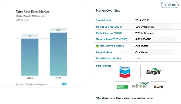 The market continues to expand steadily, supported by rising interest in renewable, bio-based ingredients across multiple industries. According to industry estimates, the fatty acid ester market is expected to grow from 1.90 million tons in 2025 to 2.20 million tons by 2030, reflecting a CAGR of less than 3% during the forecast period. This growth is driven by a shift toward naturally derived raw materials, increasing biodiesel production capacity, and stronger adoption of mild, skin-friendly ingredients in personal care formulations.