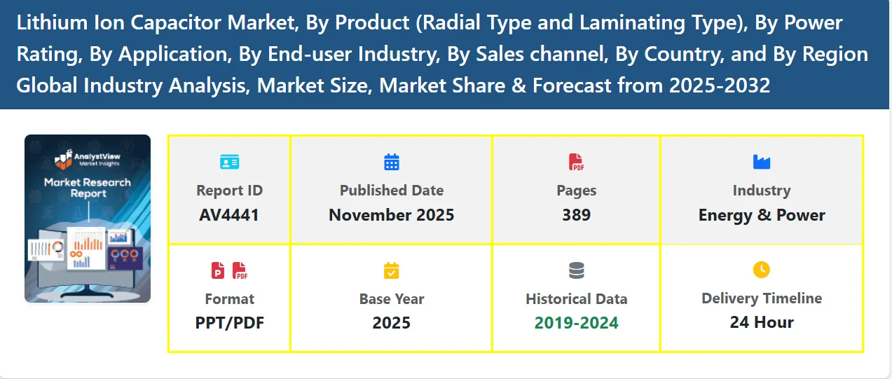 The Lithium Ion Capacitor (LIC) Market is expanding rapidly as industries seek advanced energy-storage devices that combine the high energy density of lithium-ion batteries with the fast charge–discharge characteristics of supercapacitors. Lithium ion capacitors use hybrid technology incorporating lithium-doped carbon materials, enabling significantly higher energy density than traditional supercapacitors while maintaining long cycle life and excellent power performance. This makes LICs valuable for applications requiring both quick energy bursts and prolonged operational reliability.