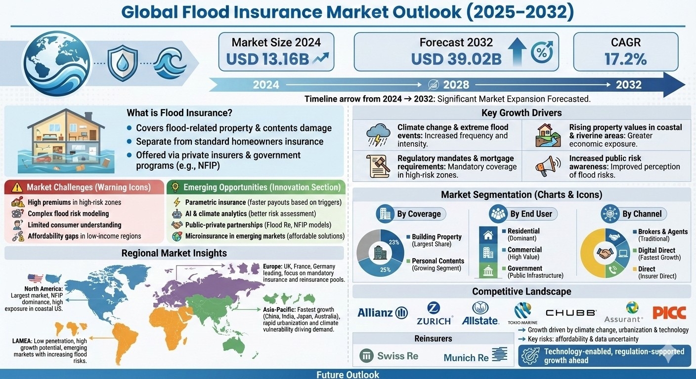 According to a new report from Intel Market Research, the global Flood Insurance market was valued at USD 13.16 billion in 2024 and is projected to reach USD 39.02 billion by 2032, growing at a robust CAGR of 17.2% during the forecast period (2025–2032). This growth is propelled by increasing climate-related disasters, rising property values in flood-prone areas, and growing awareness about financial protection against natural disasters.