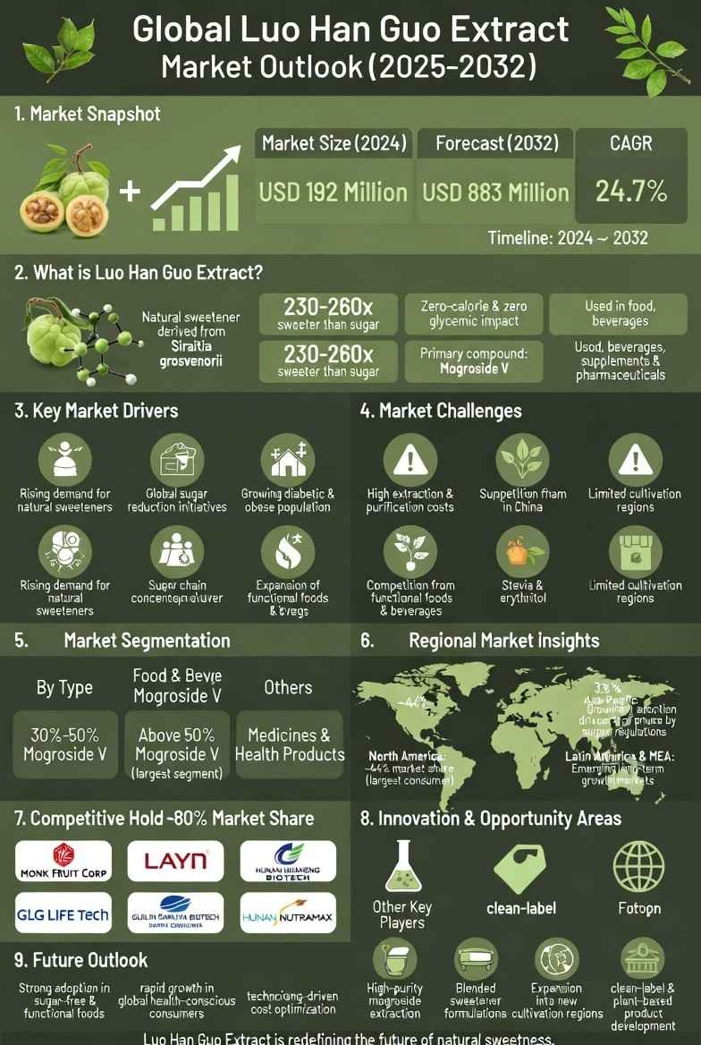According to a new report from Intel Market Research, the global Luo Han Guo Extract market was valued at USD 192 million in 2024 and is projected to reach USD 883 million by 2032, growing at an exceptional CAGR of 24.7% during the forecast period (2025–2032). This remarkable growth is driven by increasing consumer demand for natural sweeteners, rising health consciousness, and expanding applications across food, beverage, and pharmaceutical industries.