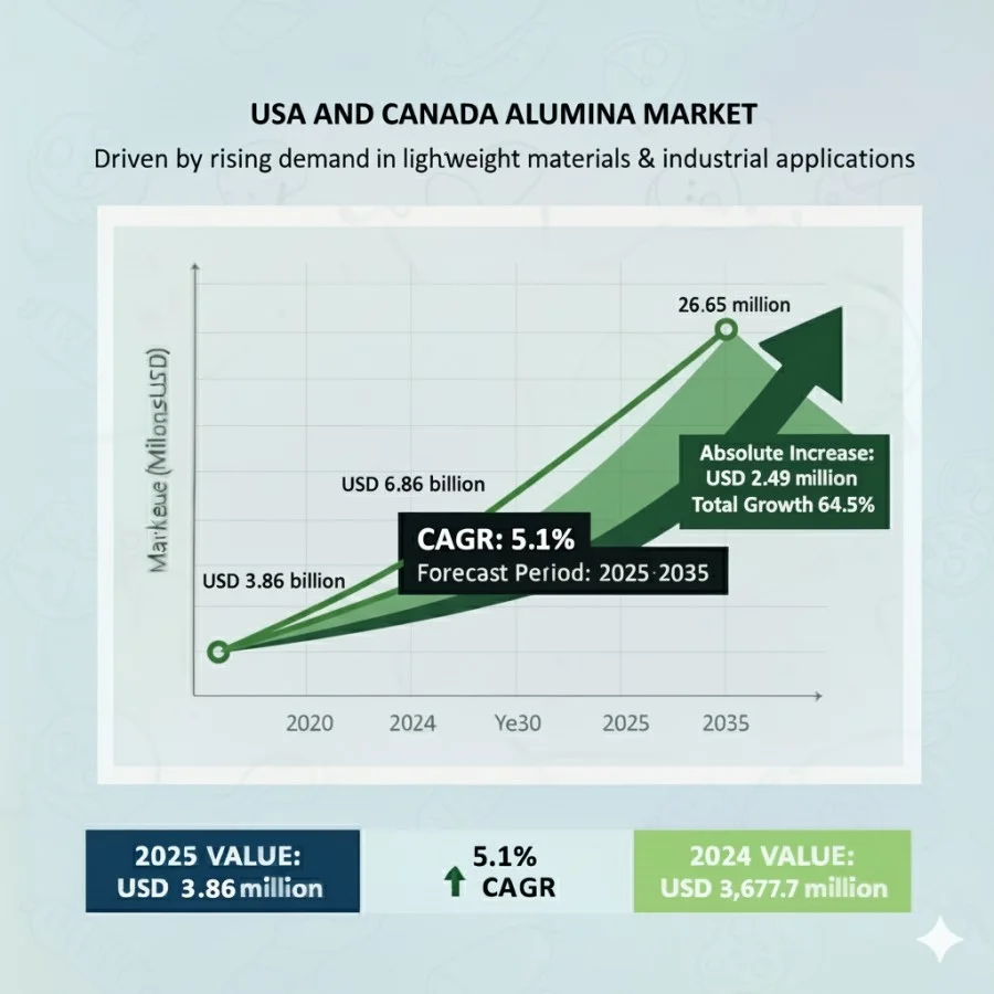The USA and Canada alumina market is poised for robust expansion through 2035, propelled by surging demand for lightweight materials in electric vehicles (EVs), aerospace components, and renewable energy systems. According to Future Market Insights (FMI), the market is valued at USD 3.86 billion in 2025 and is projected to hit USD 6.35 billion by 2035, growing at a compound annual growth rate (CAGR) of 5.1%.
