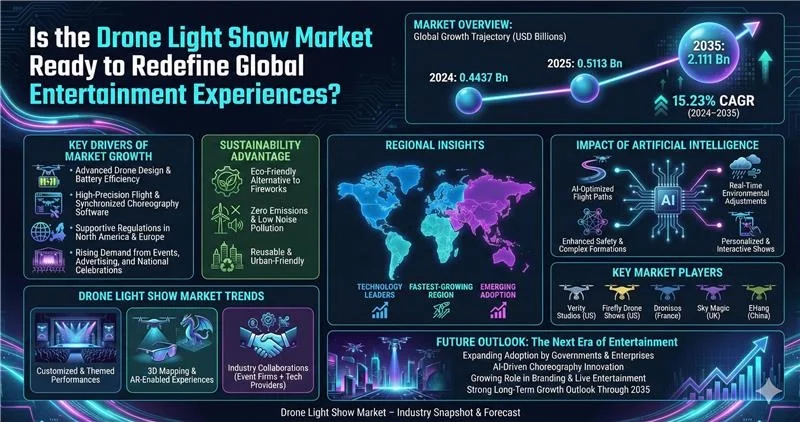As production costs decline and creative capabilities expand, the Drone Light Show Market will continue integrating into the broader aerial display ecosystem. Companies investing in AI-driven creativity, regulatory compliance, and cross-sector partnerships will capture expanding opportunities within the evolving aerial display landscape.