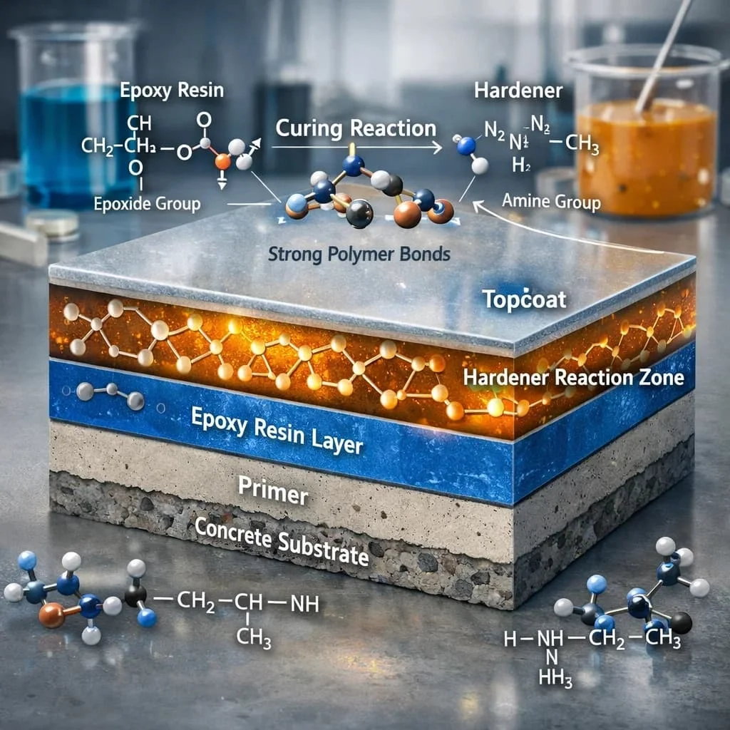 Epoxy flooring chemistry is closely related to epoxy-based tile bonding materials. Both rely on strong chemical adhesion and polymer cross-linking for performance.