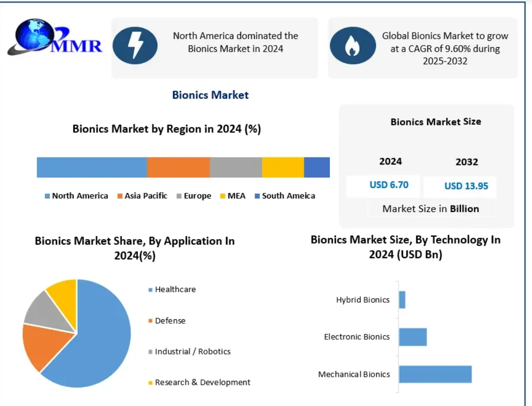 Bionics Market was valued at USD 6.70 billion in 2024, and total global Bionics Market revenue is expected to grow at a CAGR of 9.60% from 2025 to 2032, reaching nearly USD 13.95 billion.