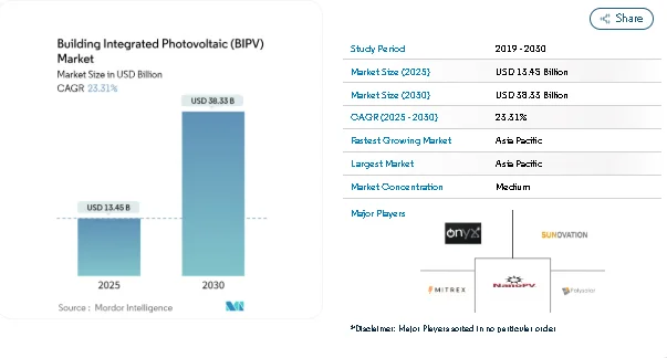 BIPV systems are designed to integrate seamlessly into building structures such as roofs, façades, and windows, generating electricity while serving as functional building components. The global Building Integrated Photovoltaics (BIPV) market is experiencing notable growth, with its size estimated at USD 13.45 billion in 2025 and projected to reach USD 38.33 billion by 2030, reflecting a CAGR of 23.31%. The rising adoption of BIPV solutions is supported by urban expansion, increasing residential construction, and government policies promoting renewable energy and energy-efficient buildings.