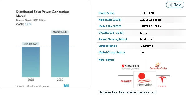 The global distributed solar power generation market is set to witness significant growth in the coming years. Valued at approximately USD 160.16 billion in 2025, the market is projected to reach USD 224.31 billion by 2030, growing at a CAGR of 6.97% during the forecast period (2025–2030). Distributed solar power generation, which involves generating electricity from solar panels installed at residential, commercial, and industrial locations, provides an alternative to traditional centralized electricity grids, offering cleaner energy and cost savings.