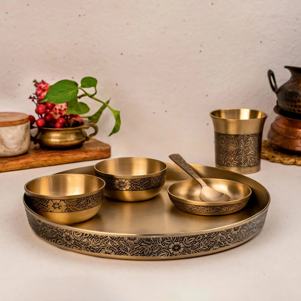 Bronze thali sets are dinnerware collections made from bronze alloy also known as kansa in traditional Indian contexts. These sets include a large plate small bowls a glass and often spoons crafted from bronze metal. The warm rich tones and handcrafted nature of bronze tableware make it an appealing choice for both everyday meals and festive feasts. What sets bronze thali sets apart is not just their aesthetic appeal but also the blend of culture wellness and durability that they bring to the dining table.