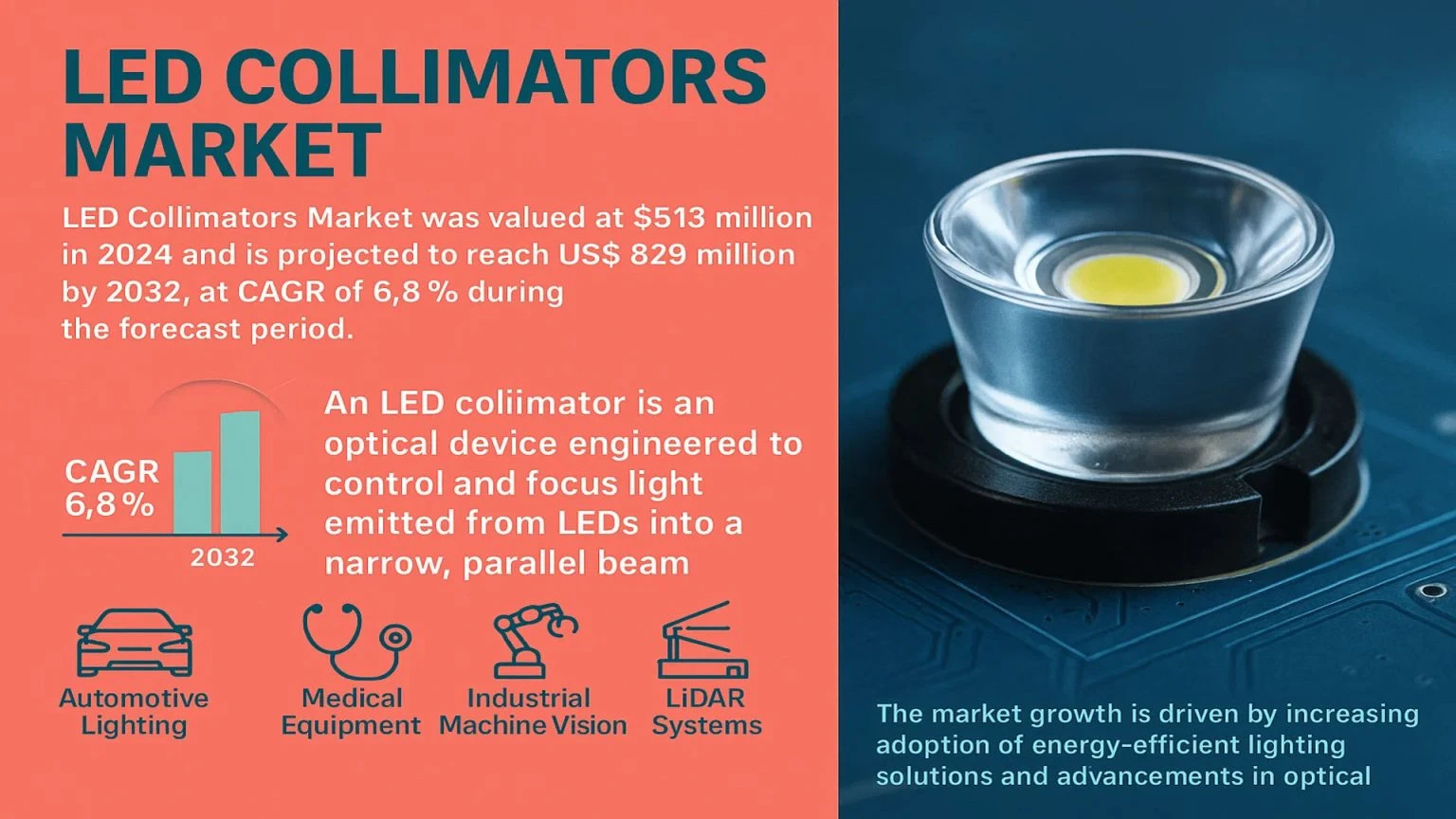 LED Collimators Market, valued at USD 513 million in 2024, is poised for substantial growth, projected to reach USD 829 million by 2032. This expansion, representing a compound annual growth rate (CAGR) of 6.8%, is detailed in a comprehensive new report published by Semiconductor Insight. The study underscores the critical function of these precision optical components in directing and controlling light output across a wide spectrum of high-technology applications, from automotive lighting to advanced medical devices.