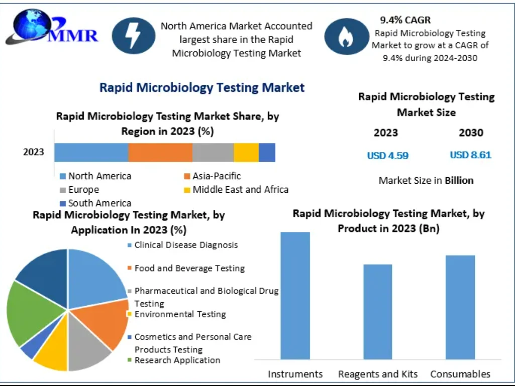 Rapid Microbiology Testing Market has valued at US$ 4.59 Bn. in 2023. The Global Rapid Microbiology Testing Market size is estimated to grow at a CAGR of 9.4% over the forecast period.