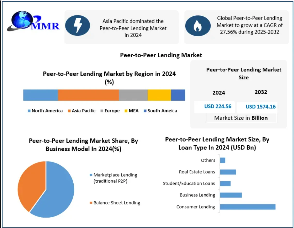 Peer-to-Peer Lending Market was valued at USD 224.56 billion in 2024, and total global Peer-to-Peer Lending Market revenue is expected to grow at a CAGR of 27.56% from 2025 to 2032