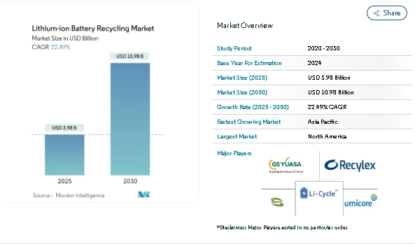 The Lithium-ion Battery Recycling Market is gaining steady attention as battery use expands across electric vehicles, energy storage systems, and industrial applications. According to Mordor Intelligence, the market size is estimated at USD 3.98 billion in 2025 and is projected to reach USD 10.98 billion by 2030, reflecting strong momentum during the forecast period.