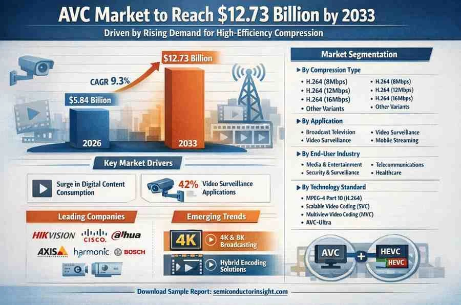 Advanced Video Coding (AVC) Market, valued at a substantial USD 5.84 billion in 2026, is positioned for remarkable growth, projected to reach USD 12.73 billion by 2033. This expansion, representing a compound annual growth rate (CAGR) of 9.3%, is detailed in a comprehensive new report published by Semiconductor Insight. The study underscores the enduring significance of AVC/H.264 as a foundational video compression standard across multiple industries, particularly in broadcasting, surveillance, and digital media delivery.