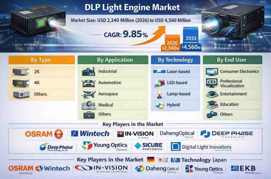DLP Light Engine Market, valued at a robust USD 2,340 million in 2026, is on a trajectory of significant expansion, projected to reach USD 4,560 million by 2033. This growth, representing a compound annual growth rate (CAGR) of 9.85%, is detailed in a comprehensive new report published by Semiconductor Insight. The study highlights the critical role of these advanced optical projection systems in enabling high-precision imaging and display solutions across various high-tech industries.