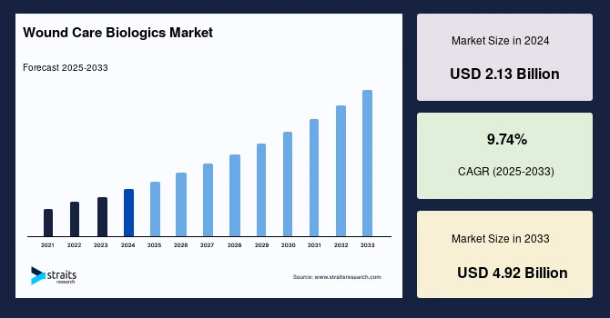 The global Wound Care Biologics Market is poised for significant growth, expanding from an estimated USD 2.13 billion in 2024 to an anticipated USD 4.92 billion by 2033, recording a strong Compound Annual Growth Rate (CAGR) of 9.74% during the forecast period (2025–2033).