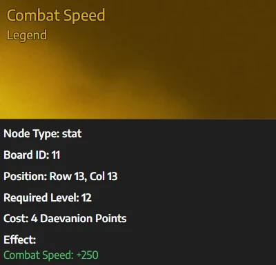 Daevanion Nodes – The primary way to improve your stat. Each node costs Daevanion Points and grants a fixed Combat Speed bonus. For example, the Combat Speed node requires 4 Daevanion Points and gives +250 Combat Speed at level 12.