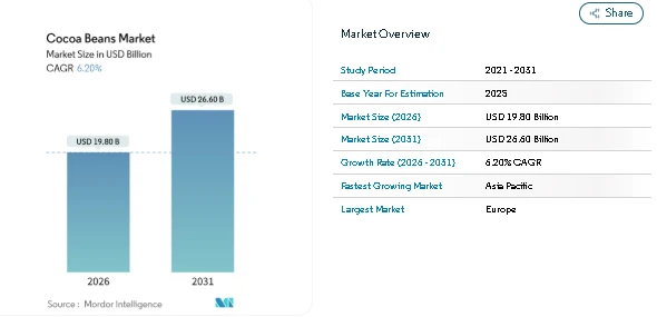 The Cocoa Beans Market continues to hold a central position within the global agri-commodity and food ingredients space, supported by steady demand from chocolate, beverage, and food processing industries. According to Mordor Intelligence, the Cocoa Beans Market Size is valued at USD 19.80 billion in 2026 and is projected to reach USD 26.60 billion by 2031, reflecting consistent expansion across both producing and consuming regions. This outlook highlights how changing consumption habits, sustainability compliance, and supply-side adjustments are shaping the Cocoa Beans Industry.