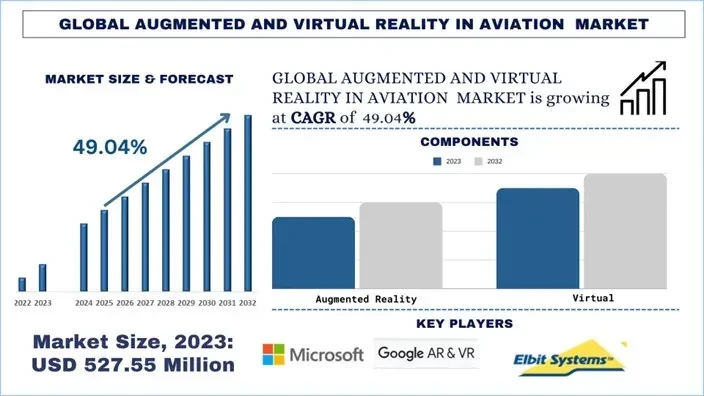 According to UnivDatos, rising investments in digital cockpit systems, enhanced pilot training, and predictive maintenance applications are significantly accelerating demand for immersive technologies in aviation. As highlighted in the “Global Augmented and Virtual Reality in Aviation Market” report, the market was valued at USD 527.55 million in 2023 and is projected to grow at a remarkable CAGR of 49.04% between 2024 and 2032, reaching USD million by 2032.