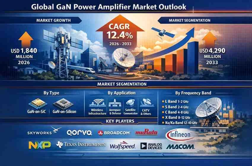 global GaN Power Amplifier market is undergoing rapid expansion as next-generation communication and defense systems increasingly rely on high-efficiency, high-frequency semiconductor solutions. Valued at USD 1,840 million in 2026, the market is projected to reach USD 4,290 million by 2033, growing at a robust CAGR of 12.4% during the forecast period 2026–2033.
