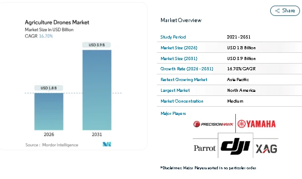 The Agriculture Drones Market is gaining steady attention as farmers look for practical ways to manage crops, labor availability, and rising input costs. According to Mordor Intelligence, the market reached a value of USD 1.8 billion in 2026 and is forecast to grow to USD 3.9 billion by 2031. The Agriculture Drones Industry benefits from falling hardware prices and growing awareness of precision farming practices.
