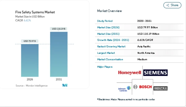 The Fire Safety Systems Market continues to gain importance as buildings become taller, denser, and more complex across both developed and emerging economies. According to Mordor Intelligence, the Fire Safety Systems Market size is estimated at USD 79.97 billion in 2026 and is projected to reach USD 110.19 billion by 2031, reflecting steady expansion during the forecast period. The Fire Safety Systems Industry covers a wide range of solutions designed to detect fire incidents early, control fire spread, and support safe evacuation.