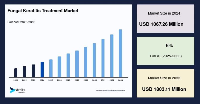 The global fungal keratitis treatment market size was valued at USD 1067.26 Million in 2024 and is anticipated to grow from USD 1131.29 Million in 2025 to reach USD 1803.11 Million by 2033, exhibiting a CAGR of 6% during the forecast period (2025–2033).
