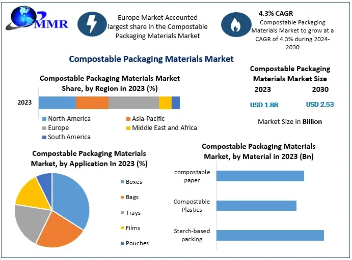 Materials for Compostable Packaging At the conclusion of the forecast period, the market value is anticipated to reach USD 2.53 billion, growing at a compound annual growth rate (CAGR) of 4.3%.