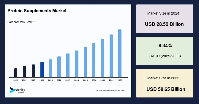 The global Protein Supplements market size was valued at USD 28.52 billion in 2024 and is projected to reach from USD 30.90 billion in 2025 to USD 58.65 billion by 2033 at a CAGR of 8.34% from 2025 to 2033.
