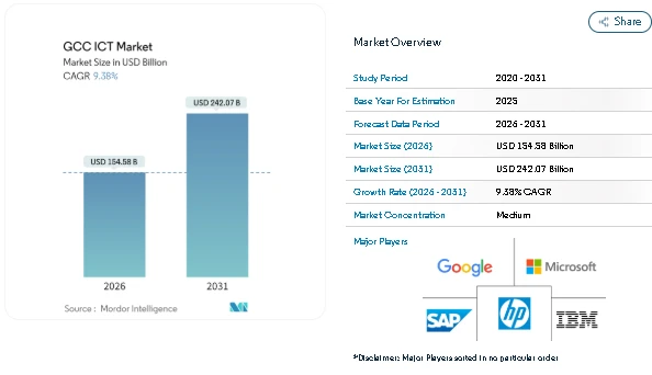 The GCC ICT Market plays a central role in the region’s digital economy, supporting government services, enterprise operations, and consumer connectivity across Saudi Arabia, the United Arab Emirates, Qatar, Oman, Kuwait, and Bahrain. According to Mordor Intelligence, the market was valued at USD 141.32 billion in 2025 and is projected to grow from USD 154.58 billion in 2026 to USD 242.07 billion by 2031.