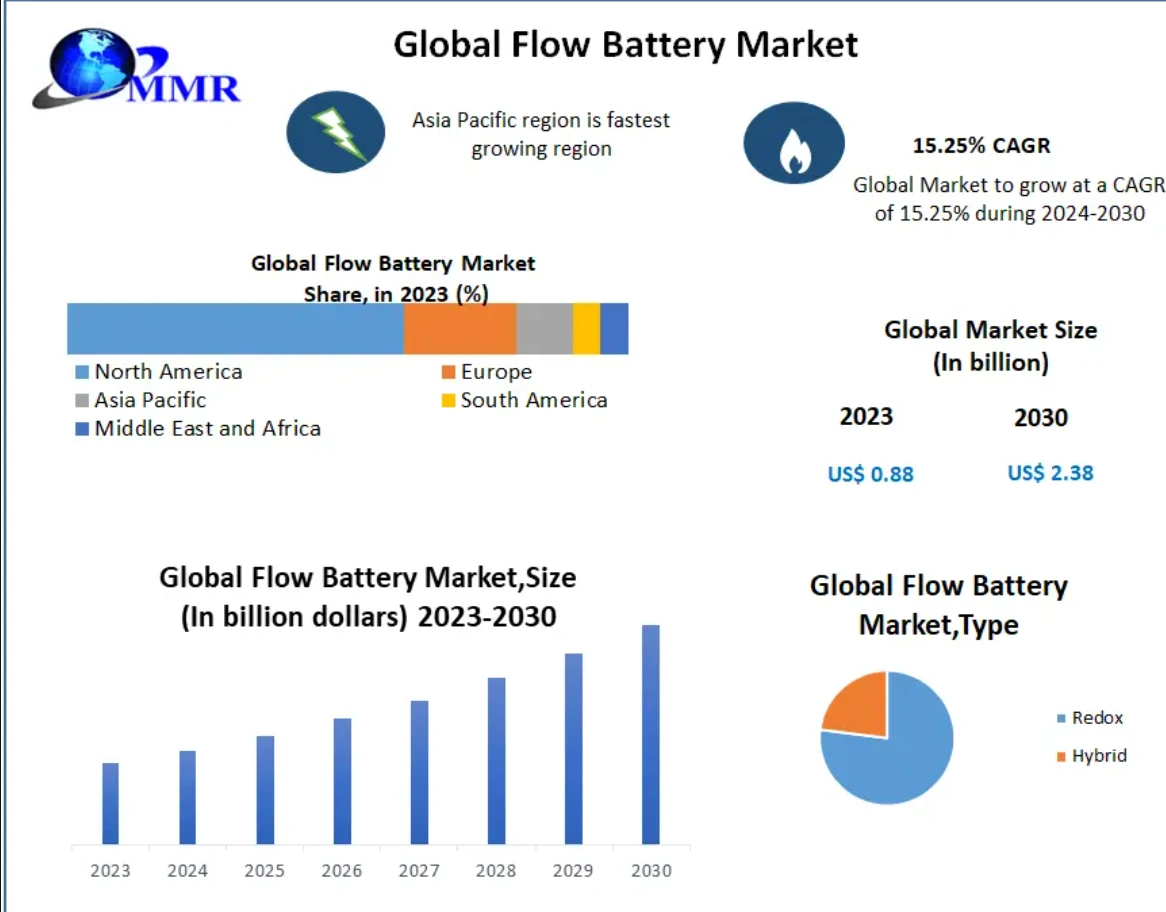 The Flow Battery Market size was valued at USD 0.88 Bn in 2023 and the total revenue is expected to grow at a CAGR of 15.25 from 2024 to 2030, reaching nearly USD 2.38 Bn.