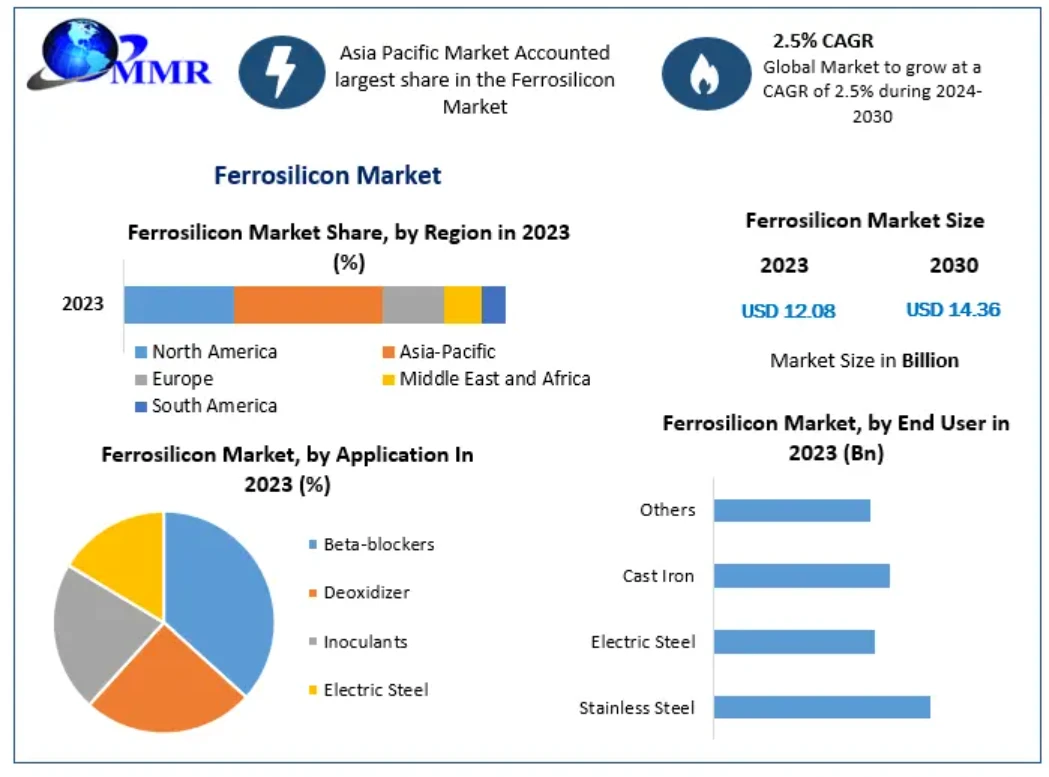 The Ferrosilicon Market size was valued at USD 12.08 Bn in 2023 and is expected to reach USD 14.36 Bn by 2030, at a CAGR of 2.5%