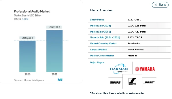 The Professional Audio Market continues to expand as sound quality becomes a core requirement across live events, media production, corporate spaces, and public venues. According to Mordor Intelligence, the market was valued at USD 12.50 billion in 2025, is estimated at USD 13.26 billion in 2026, and is projected to reach USD 17.82 billion by 2031.